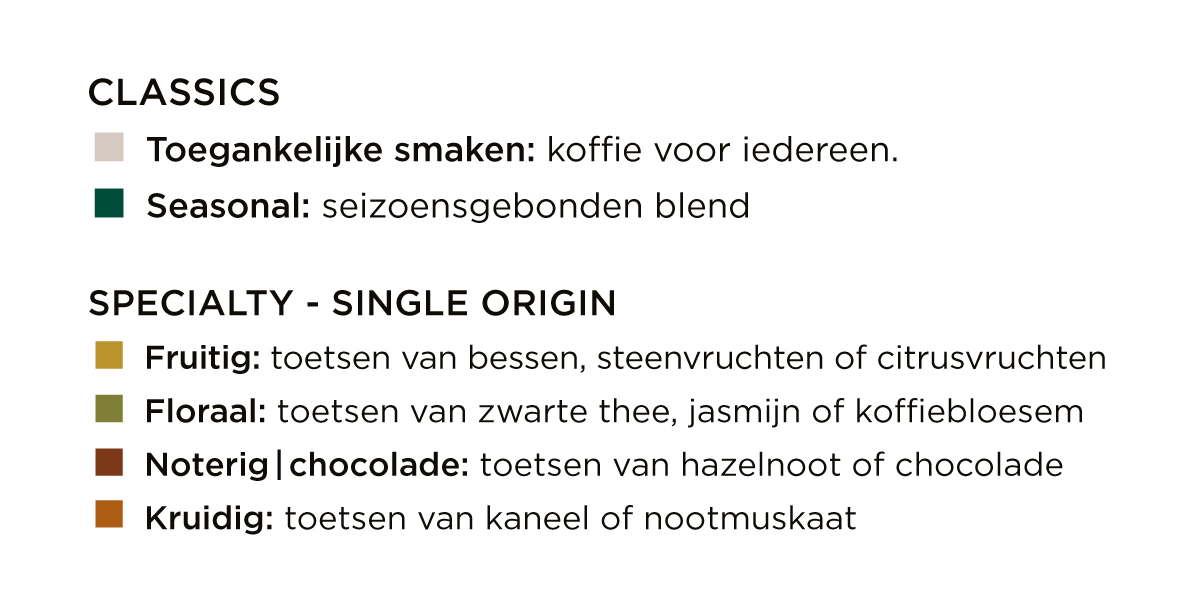 De kleurencode van het etiket zegt iets meer over de smaak van de koffie. Verkies je een klassieke koffie of waag je je liever eens aan een florale of kruidig koffie? Het kan allemaal!