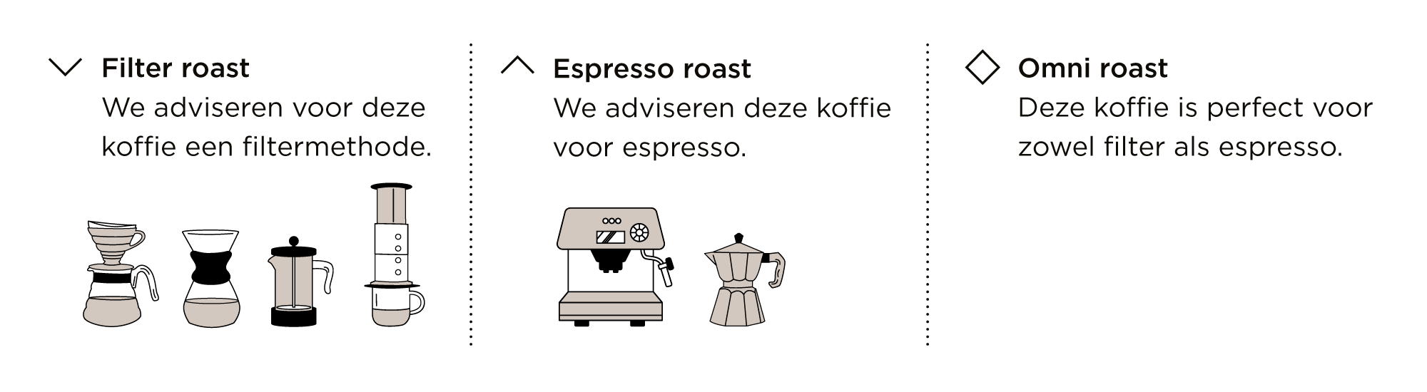 Op het etiket vind je in de rechtse bovenhoek een symbooltje. Dit symbooltje verwijst naar de zetwijze die wij adviseren voor deze specifieke koffie.